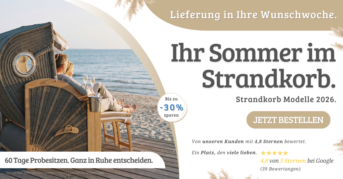 Lassen Sie sich nicht vom Namen beirren: Sie müssen nicht auf den nächsten Sommerurlaub warten und auch nicht in aller Frühe aufstehen, um sich den besten Platz in einem komfortablen Strandkorb zu sichern. Denn Strandkörbe für die eigenen vier Wände liegen voll im Trend – ob auf dem Balkon eines Singlehaushalts oder im eigenen Garten. Kein Wunder, denn in einem Strandkorb auf der Terrasse können Sie jederzeit entspannen: Sie bieten Ihnen die Erholung, als seien Sie an der Nordsee, schützen vor Sonne und Wind und den neugierigen Blicken der Nachbarn, kurz: Strandkörbe sind idealer Rückzugsort, ohne einen langen Reiseweg antreten zu müssen. Und dank der großen Auswahl und vielfältigen Designs, ist für jedes Ambiente der passende Strandkorb zu haben und ein toller Blickfang im eigenen Zuhause.